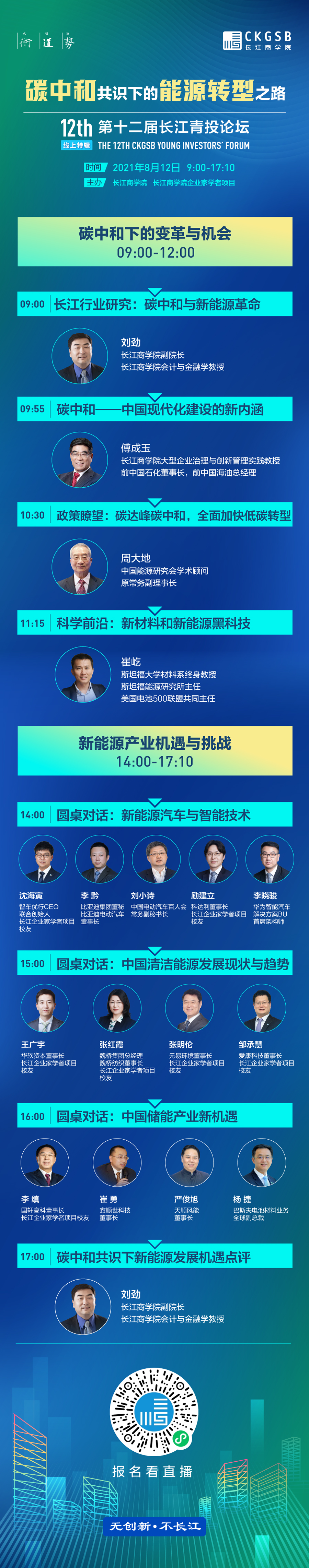 如何实现碳中和?如何解决碳中和的经济问题?“双碳目标”下的能源结构和产业结构将会有哪些变革和重塑?新能源产业作为达成双碳战略的关键环节又将面临哪些机会与挑战?新一轮科技创新和投资的机遇在何方?对非能源相关的企业又将带来什么影响?2021年8月12日,17位顶尖专家学者及行业翘楚将做客长江商学院第十二届青投论坛,共话碳中和共识下的能源转型之路。