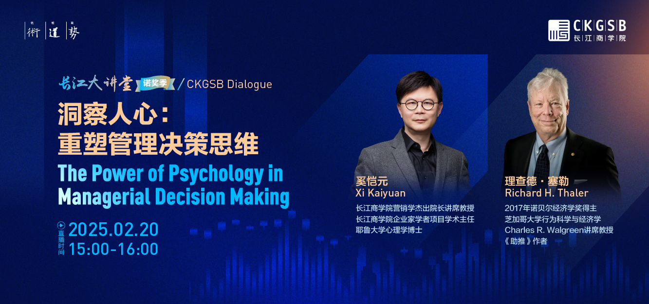 2025年2月20日(周四),长江商学院营销学杰出院长讲席教授、企业家学者项目学术主任奚恺元将与2017年诺贝尔经济学奖得主、“行为经济学之父”、《助推》作者理查德·塞勒(Richard H. Thaler)进行一场精彩的越洋对话,共同解读行为科学对商业管理和人类生活的深远影响。
