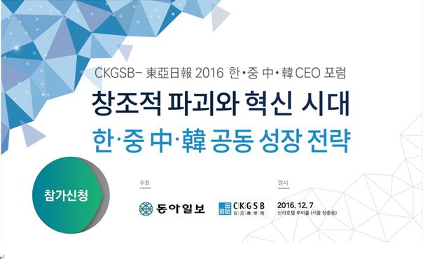 长江商学院“2016中韩CEO论坛”将于12月7日在韩国首尔举行,本届论坛的主题是“中韩企业在颠覆式创新时代的共同成长”。届时来自中韩两国的优秀企业家、学者、媒体代表等近200人将出席本次论坛,围绕ICT产业、互联网商业、O2O产业、共享经济、娱乐传媒产业、新媒体、文创等话题展开讨论,共同探讨创大变革时代中韩企业的发展战略及背后的合作与挑战。作为“2016东亚商业论坛”的重要组成部分,“2016中韩CEO论坛”由长江商学院携手韩国最具影响力的传媒集团之一《东亚日报》联合主办。今年是长江商学院继2015年后,连续第二年举办中韩CEO论坛。