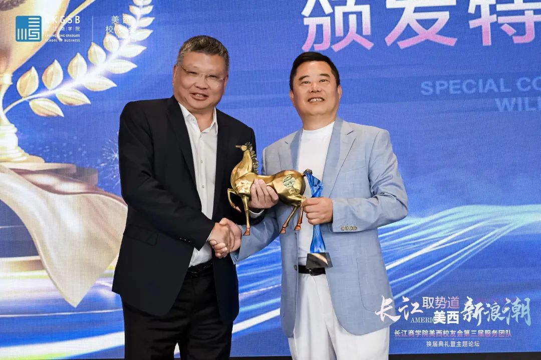 此次换届典礼标志着美西校友会自创立十周年的重要节点。在特别贡献奖颁发环节,长江商学院创办院长项兵教授为美西校友会名誉会长傅建军颁发荣誉奖杯,表彰其在过去十年中为推动美西校友组织发展所作出的卓越贡献。随后,傅建军会长满怀深情地发表致辞,回顾十年奋斗征程,并对新一届团队寄予厚望。