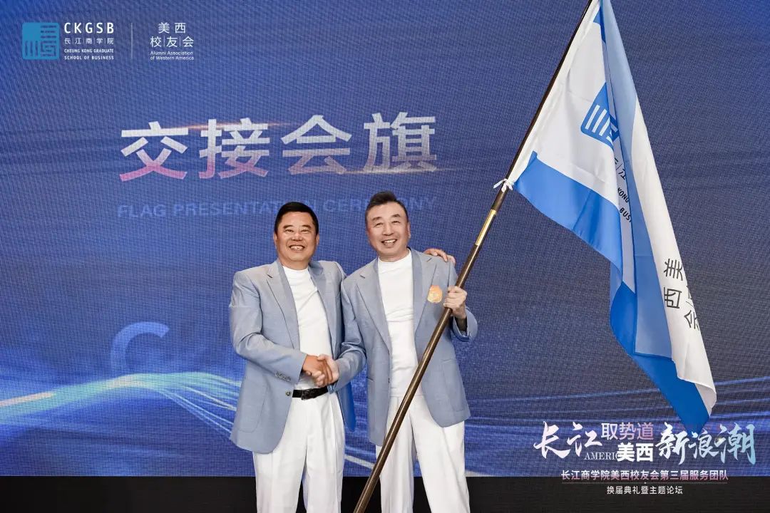 在庄重肃穆的授旗仪式中,美西校友会名誉会长傅建军将象征使命与责任的会旗郑重交接至第三届会长姜放手中,昭示着长江精神的延续与新的责任传承。