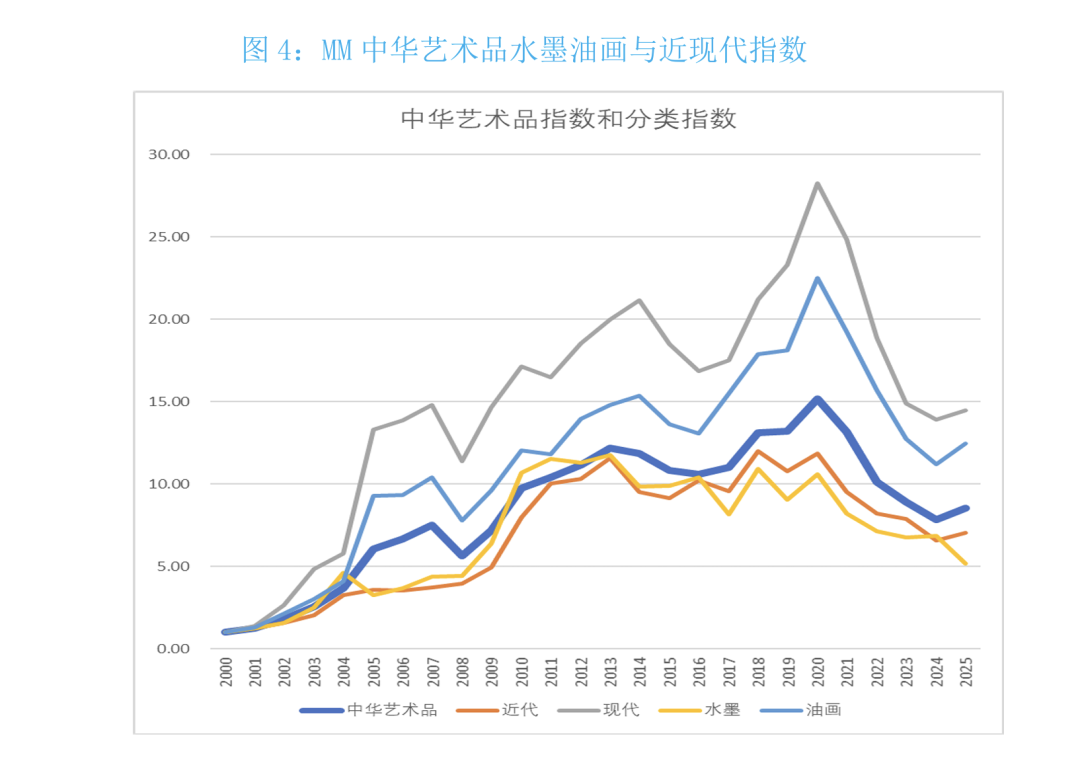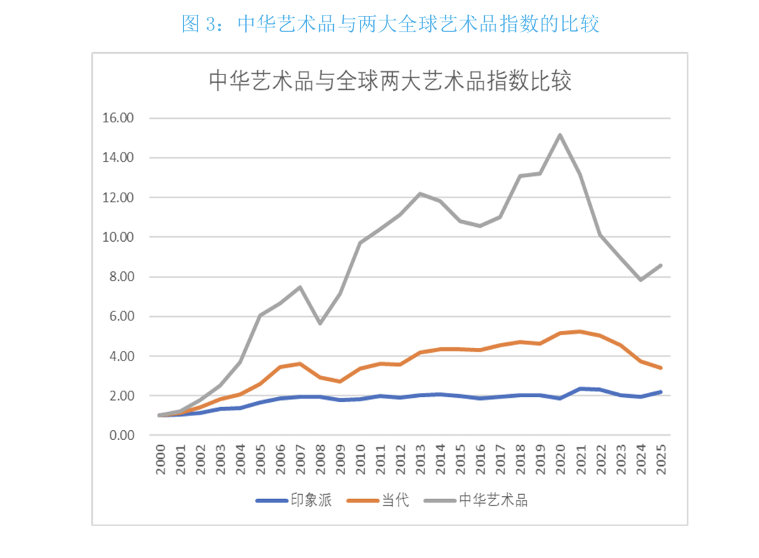 从图3可见,在2000-2025年间,中华艺术品大幅跑赢印象派和当代艺术品指数。在这期间,印象派和当代艺术品的年复合增长率分别为3.2% 和5.1%。印象派和当代分别于2021年达到历史最高点,然后于最近三年分别下跌了16%和28.6%。