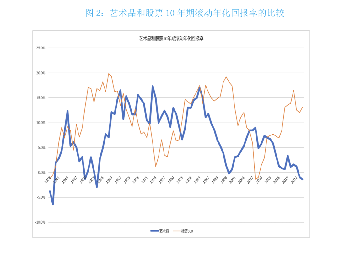 这与美国股市(以标普500指数为代表)形成了鲜明对比,自2018年以来,标普500指数每年都实现了两位数的年增长。艺术品与股票在长期回报上的巨大差异表明,艺术品价值现在总体上处于几代人未见的低迷状态。2008年后,这两种资产的财务表现急剧分化,股市享受了15年的牛市,而艺术品市场的长期回报率则逐步下降,随后陷入深度冻结。