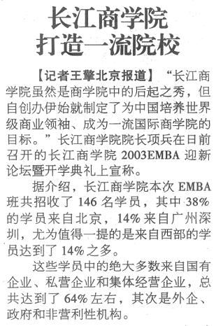 长江商学院成立于2002年11月21日,是教育部批准设立的拥有独立法人资格的非营利性中外合作办学机构,是国务院学位委员会批准的“工商管理硕士授予单位”(含EMBA和MBA),为国际管理教育协会(AACSB) 和欧洲管理发展基金会(EFMD)成员,并获得AACSB和EQUIS认证。学院总部位于北京,现设有工商管理硕士项目(MBA);高级工商管理硕士项目(EMBA);企业家学者项目;高层管理教育项目(EE)及全球独角兽项目。