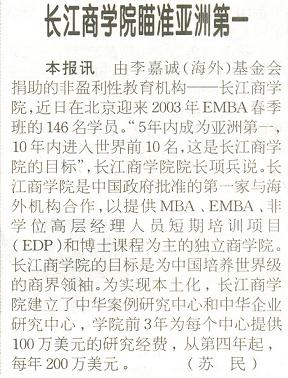 长江商学院成立于2002年11月21日,是教育部批准设立的拥有独立法人资格的非营利性中外合作办学机构,是国务院学位委员会批准的“工商管理硕士授予单位”(含EMBA和MBA),为国际管理教育协会(AACSB) 和欧洲管理发展基金会(EFMD)成员,并获得AACSB和EQUIS认证。学院总部位于北京,现设有工商管理硕士项目(MBA);高级工商管理硕士项目(EMBA);企业家学者项目;高层管理教育项目(EE)及全球独角兽项目。
