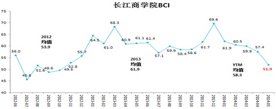 “长江商学院中国企业经营状况指数”(Business Conditions Index,下称长江商学院BCI),2014年5月数据为51.9,上月为57.4(图1)。50为荣枯线,这意味着样本企业—长江商学院在校学员和校友的所属企业—的高管对未来经营环境保持比较乐观的态度,但就连续五个月持续下滑的数据看,企业对未来经济预期“热度”逐渐降低,宏观经济增长动力略显疲弱,其中对房地产活动预期下降将是下半年中国经济面临的最大的下行风险。
