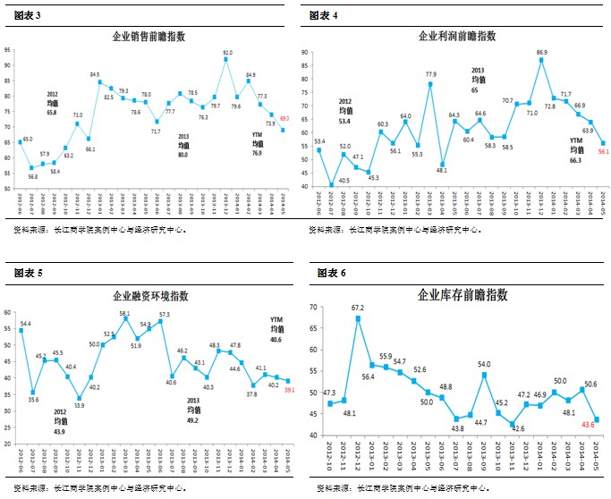 5月企业销售前瞻指数69,利润前瞻指数56.1,较上月数据均有不同程度的下滑(图表3、4),但目前两个指数均位于50荣枯线以上,表明多数样本企业对未来6个月的销售和利润预期仍比较乐观。比较两项指数与BCI趋势,可以看到,销售和利润连月的预期下滑与企业的未来经营预期是正相关的。