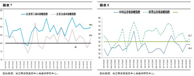 5月消费品价格前瞻指数数据显示为53.7(图表8),表明大多数企业对消费品价格预期上涨。而中间品价格前瞻指数本月基本与上月持平,数据为46.4,表明大多数企业对中间品价格预期下跌。从总体趋势看,我国通胀压力一直维持在较高水平,与此同时,由于库存问题得不到有力解决,中间品价格也始终处于低迷的状况。