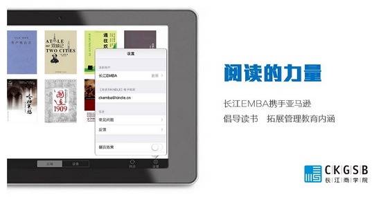 2014年10月,长江商学院EMBA秋季班开学前夕,携手亚马逊中国,以Kindle电子书客户端为载体,将在未来的一年中,逐步以电子书形式取代纸质教材教辅,全面实现EMBA课程的教科书电子化。