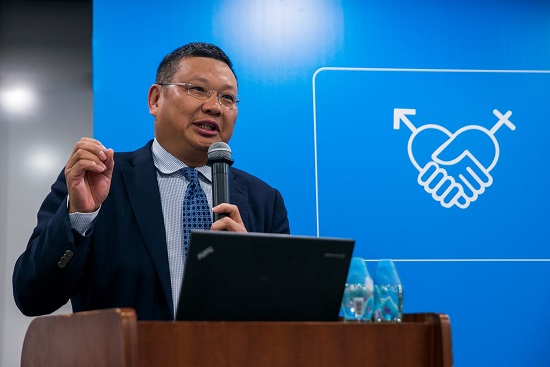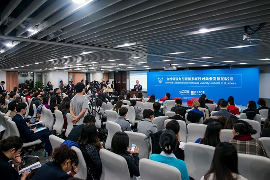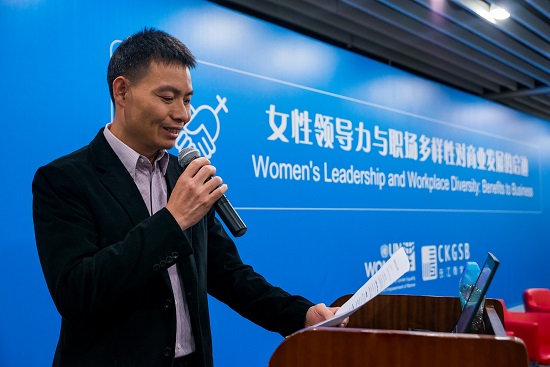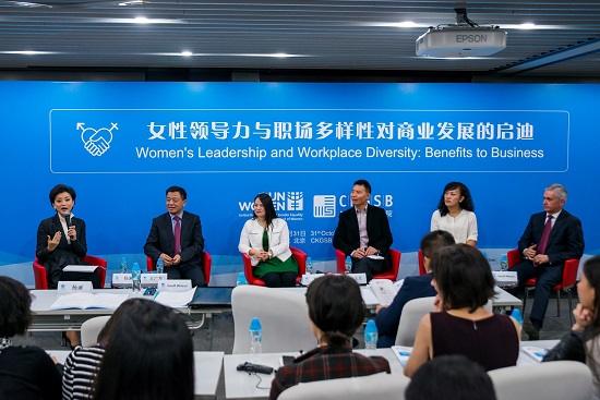 图1,长江商学院(CKGSB)与联合国促进性别平等和增强妇女权能署(简称联合国妇女署或UN Women)共同举办的“女性领导力与职场多样性对商业的启迪”研讨会现场