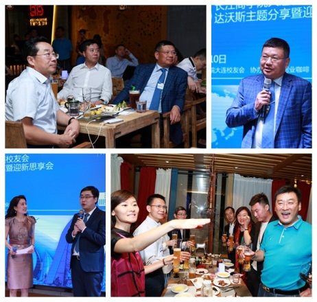 图5,9月10日,项兵院长出席达沃斯长江校友之夜,与滴滴打车创始人程维(左下图)等30余位出席达沃斯的长江校友及大连当地校友共话情谊