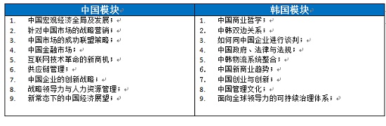 K-EMBA课程在韩国首尔,以及中国北京、上海、深圳等地展开,内容覆盖与中国和韩国市场密切相关的丰富课题(详见表1)。完成为期18个月课程并合格的同学,将获得由长江商学院和aSSIST分别颁发的学位。