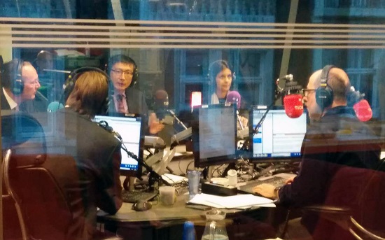 长江商学院经济学教授李伟(左起第三)在BBC Radio直播节目中讲话