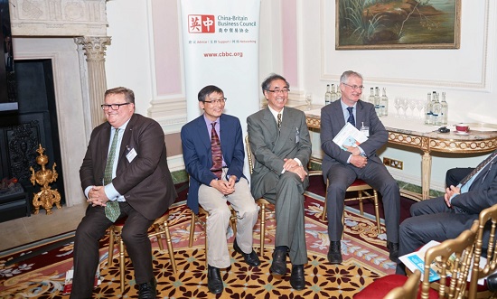 讨论嘉宾(从左至右):英中贸易协会总裁傅仲森,长江商学院李伟教授,长江商学院经济学教授杨瑞辉,英国《金融时报》副主编James Kynge
