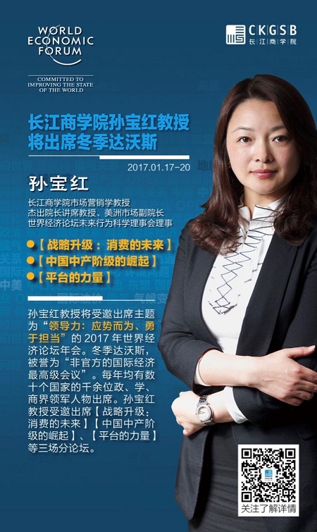 2017年冬季达沃斯论坛(即第47届世界经济论坛年会)将于2017年1月17-20日在瑞士达沃斯举行,论坛主题为“领导力:应势而为、勇于担当”。长江商学院副院长、市场营销学教授、杰出院长讲席教授孙宝红博士将应邀出席本届论坛,并参加“战略升级:消费的未来”、“中国中产阶级的崛起”、“平台的力量”等三场对话讨论。冬季达沃斯论坛被称为“非官方的国际经济最高级会议”,今年共有来自全球70多个国家的政府代表,超过1000家全球企业的CEO,新任联合国秘书长安东尼奥·古特雷斯(António Guterres)及多个重要国际组织的负责人,社会各界领袖等3000多人将出席本届论坛。中国国家主席习近平将出席论坛,并在开幕式上发表主旨演讲。