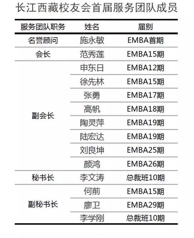 在校友会成立仪式上,长江校友事务及发展部主任杨晓燕老师宣读了《长江商学院西藏校友会服务团队名单》,向西藏校友会首届会长范秀莲授会旗,并向服务团队颁发了任命书。长江西藏校友会首届服务团队成员包括:由EMBA首期施永敏担任名誉顾问;由EMBA15期范秀莲担任会长;由EMBA12期申东日、EMBA15期徐先林、EMBA17期张勇、EMBA18期高帆、EMBA19期陶灵萍、EMBA19期陆宏达、EMBA25期刘良坤、EMBA26期颜鸿8位校友担任副会长;由总裁班10期李文涛担任秘书长;由EMBA15期何前、EMBA29期廖卫、长江总裁班10期李学刚3位校友担任副秘书长。任期三年,由2017年7月16日至2020年7月15日。
