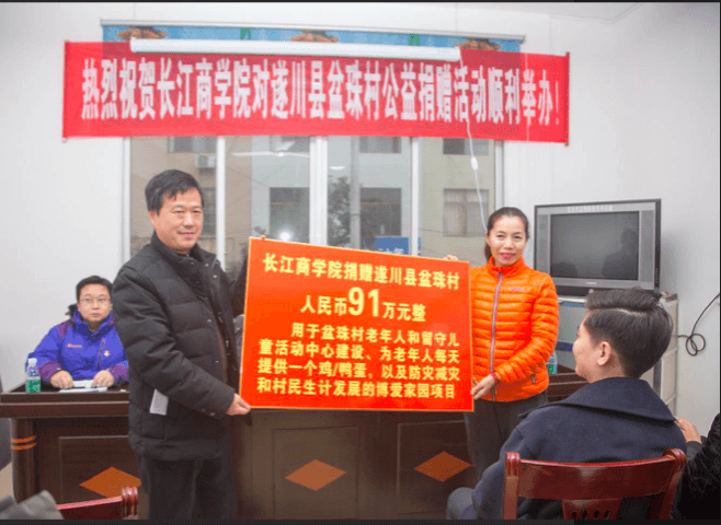 长江商学院-遂川精准扶贫公益项目主要包括:针对遂川县作为国家贫困县,青壮年大多在外务工的“关爱留守儿童、老人活动爱心公寓”项目;为老人提供营养餐的“一个鸡/鸭蛋”项目;针对地质灾害突发,村民生计的红基会“博爱家园”项目。整体捐赠金额达人民币九十一万元整。