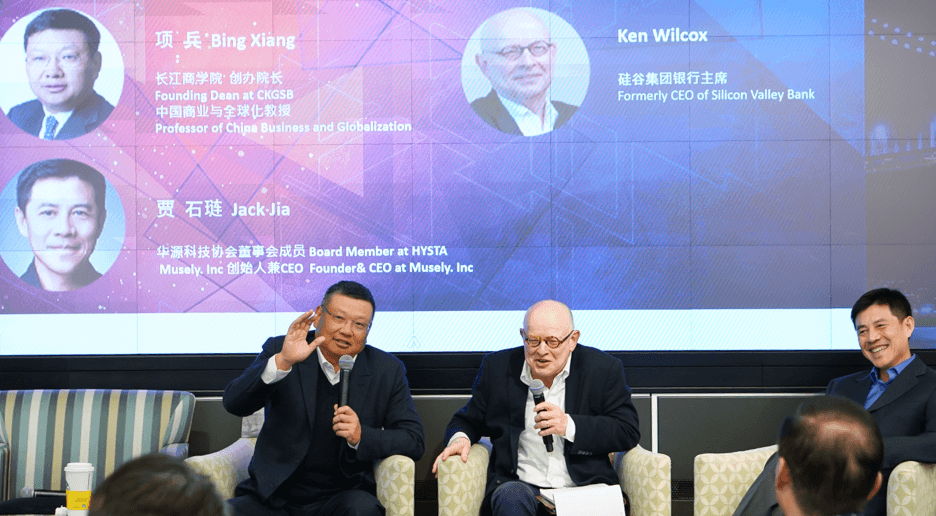 “中美科技创新及其全球影响力”围炉对话(左起):项兵院长、硅谷银行金融集团主席Ken Wilcox、华源科技协会董事会成员贾石琏