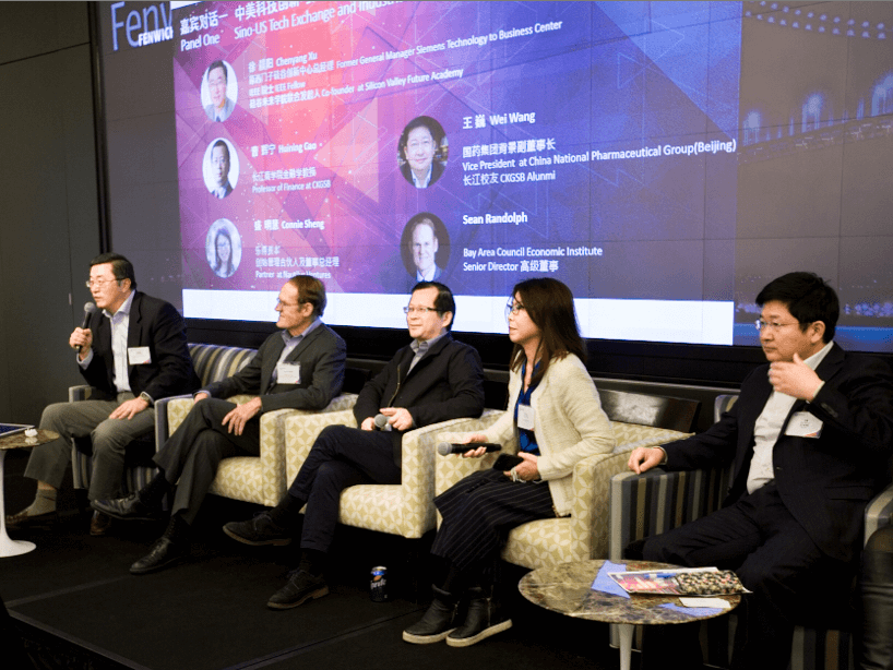 “中美科技交流与产业升级”嘉宾对话环节(左起):硅谷未来学院联合发起人徐晨阳、湾区委员会经济研究所总裁兼CEO Sean Randolph、长江商学院金融学教授曹辉宁、乐得资本创始管理合伙人及董事总经理盛明慧、国药集团北京公司副董事长、长江校友王巍