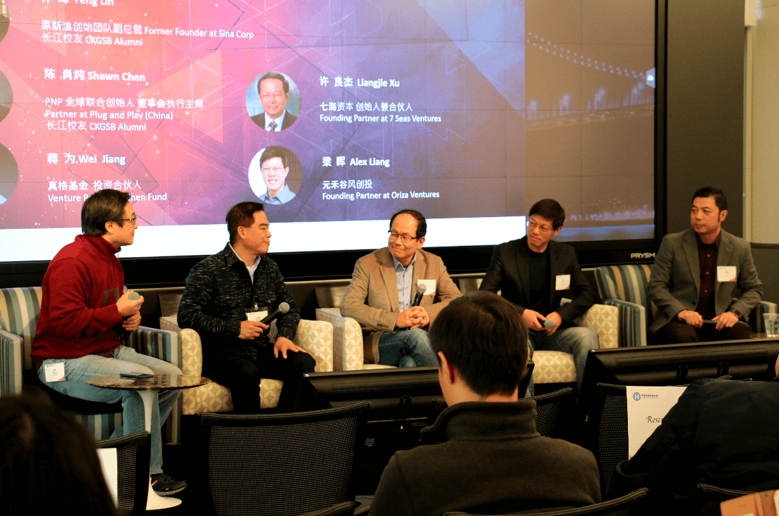 “中美跨境投资机遇与挑战”嘉宾对话环节(左起):原新浪创始团队及副总裁、天际网创始人、长江校友林峰、Plug & Play全球联合创始人、董事会执行主席、长江校友陈肖纯、七海资本创始合伙人、前华源科技协会主席许良杰、元禾谷风创投创始合伙人梁辉、真格基金投资合伙人蒋为