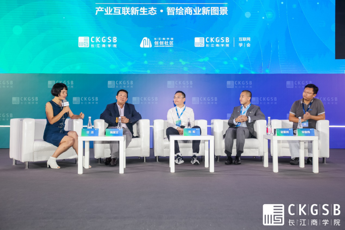 长江商学院金融学教授、校友事务副院长、智造创业MBA项目发起人甘洁(左一),华为董事、质量流程IT总裁,长江EMBA校友陶景文(左二),慧聪集团董事会主席刘军(左三),采芯网、百芯智能制造创始人、长江智造创业MBA校友宋俊纬(右一),微埃智能创始人、长江智造创业MBA校友赵紫州(右二)在巅峰对话环节展开对话