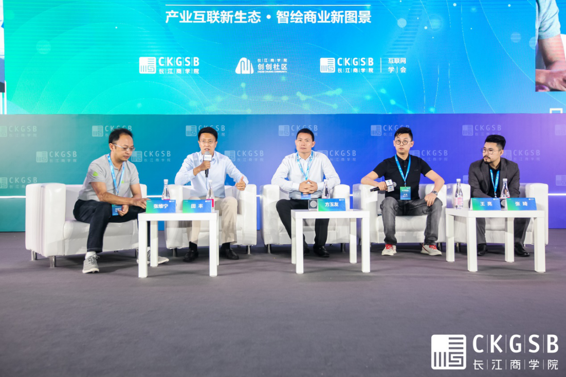 长江商学院副教授、长江创创社区学术主任张维宁(左一),商汤产业战略研究院院长,阿里云研究院创始人田丰(左二),珀莱雅化妆品股份有限公司CEO、长江CEO项目校友方玉友(左三),宋小菜联合创始人、长江创创社区校友张琦(右一),悦会会员Yhouse创始人、长江创创社区校友王亮(右二)在巅峰对话环节展开深度对话