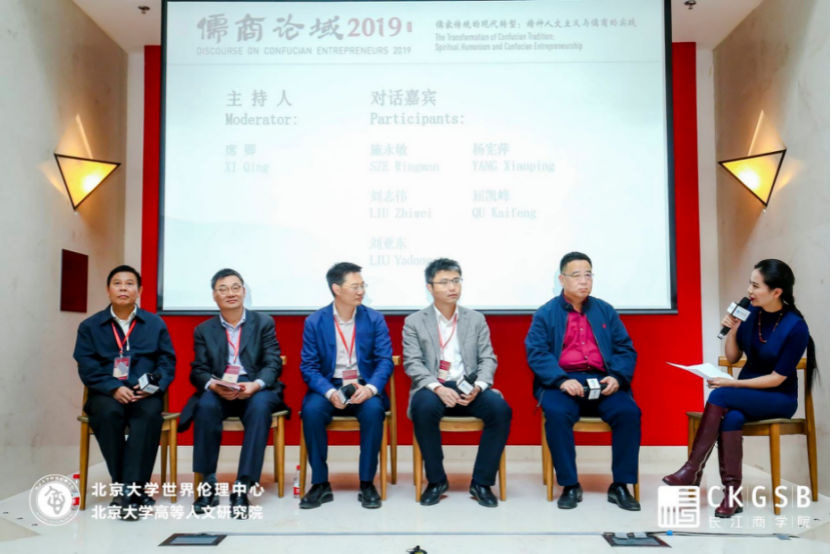 独立学者、长江商学院EMBA14期校友杨宪萍;精裕投资有限公司董事长、长江商学院EMBA 首期校友施永敏;联合镁业总裁、长江商学院EMBA13 期校友刘志伟;北京云道智造科技有限公司董事长屈凯峰;南开大学新闻传播学院院长、科技日报原总编辑刘亚东;新华网客户端执行总裁、新华社主任记者席卿对话“精神人文主义视域下的儒商实践——人工智能与伦理”
