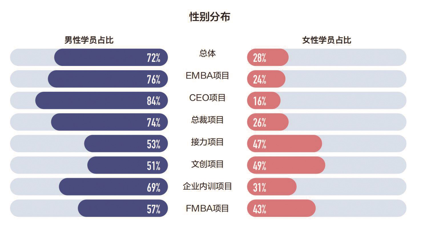 从不同项目的性别分布上,我们可以看到一些差异。其中,女性学员占比最高的三个项目分别是文创项目、接力项目和FMBA项目,分别为49%,47%,43%。文创项目学员中包括来自传统行业、文创行业的高管,以及文创领域的投资人;接力项目学员均为家族企业后代,年龄在25~33岁之间,80%具有海外留学经历;FMBA学员中来自金融与实业背景的学员近乎各为一半,平均年龄在30~35岁左右。从中可以看出,在更为年轻化的群体中,在更具创意性和专业度的领域,高管的性别分布更为均衡。