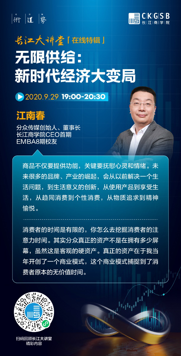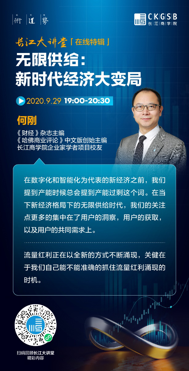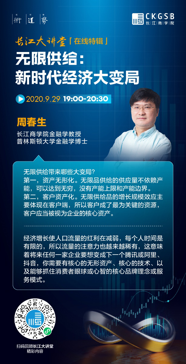 2020年9月29日 北京 近年来,以智能化、数字化为代表的新经济正在中国以及世界范围内蓬勃发展,重塑了宏观经济的运行机制,基于资源稀缺性的传统经济学核心假设正在被颠覆,科技创新与数字经济已经催生出了无限供给新时代。长江商学院品牌论坛“长江大讲堂”举办线上特辑,聚焦探讨“无限供给:新时代经济大变局”。特邀长江商学院金融学教授、普林斯顿大学金融学博士周春生教授,分众传媒创始人、董事长、长江商学院 CEO 首期、EMBA8 期校友江南春,《财经》杂志主编、《哈佛商业评论(中文版)》创始主编、长江商学院企业家学者项目首二期同学何刚共同就“无限供给现象给社会生活、经济增长、企业管理带来的新问题及新机遇”等话题展开了讨论。