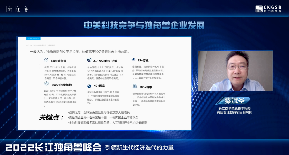长江商学院战略学教授、高层管理教育项目副院长滕斌圣发表主题为《中国独角兽企业概况与发展趋势》的主旨演讲。滕教授表示,中国独角兽企业数量以年均45%的速度在增长,这种快速增长既来自于科技创新和企业家精神的释放,也受益于全球化影响下科技商业人才的培养和引进。中国独角兽企业主要在电子商务和人工智能行业,其中电商依然是中国独角兽最为密集的领域。在中国,硬科技越来越受到重视背后可能有五大原因:第一,中国进入了技术驱动发展的历史阶段;第二,从主流的外部环境看,硬科技到了厚积薄发的节点;第三,从全球经济资本环境看,美元体系通胀和资本寒冬也为中国硬科技创新带来历史性良机;第四,全球政经的新格局让中国企业必须自建技术生态体系;第五,中国宏观环境的发展让硬科技的投入和产出有了非常正面的环境。对于独角兽企业来讲,技术创新和商业模式创新是两大支柱,在商业模式创新已经非常充沛的大环境下,有理由相信底层的技术创新会迎来它的春天。