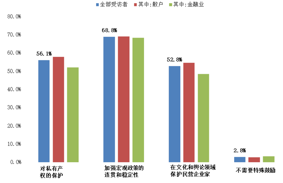 在我们询问受访者如何提高民企的信心时,约70%的受访者认为应该加强宏观政策的连贯和稳定性,约56%的受访者认为应该加强对私有产权的保护,约52%的受访者认为应该在文化和舆论领域保护民营企业家,只有不到3%的受访者认为民营企业不需要特殊的鼓励(图21)。