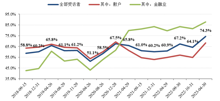 本期,投资者对A股的预期明显提高,约74.3%的受访者认为A股会上涨(散户和金融业分别为68.3%和87.8%),比上期提高10.2个百分点(散户和金融分别提高13.6和6.3个百分点)(图1)。