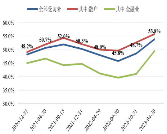 对港股的预期回报率为1.3%(散户和金融业分别为0%和4.3%),比上期提高了2.5个百分点(散户和金融业均提高了2.7个百分点)(图4)。