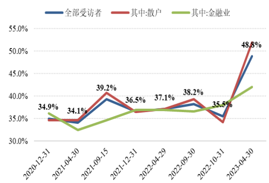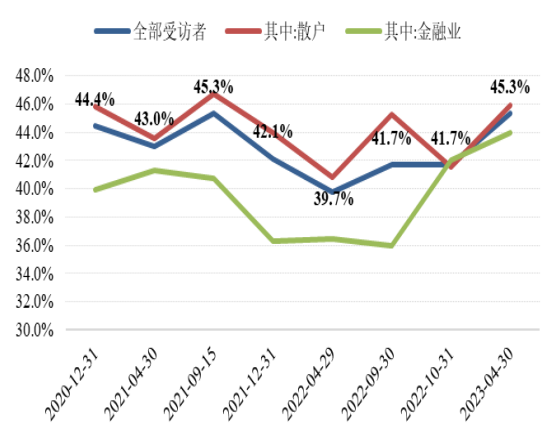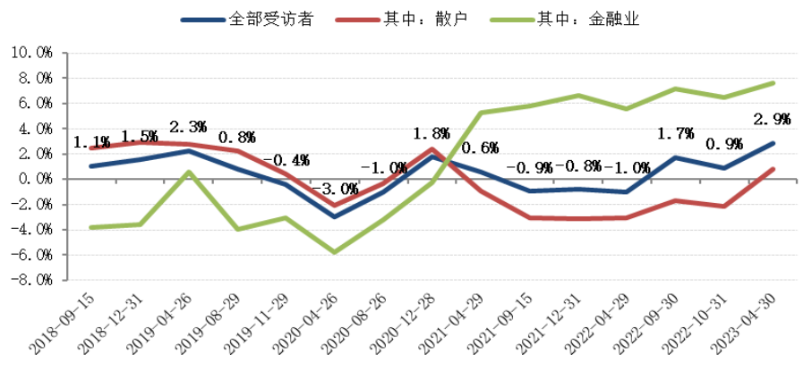 投资者对A股的预期回报率是2.9%(散户和金融业分别为0.8%和7.6%),比上期提高2个百分点(散户和金融分别提高2.9和1.1个百分点)(图2)。