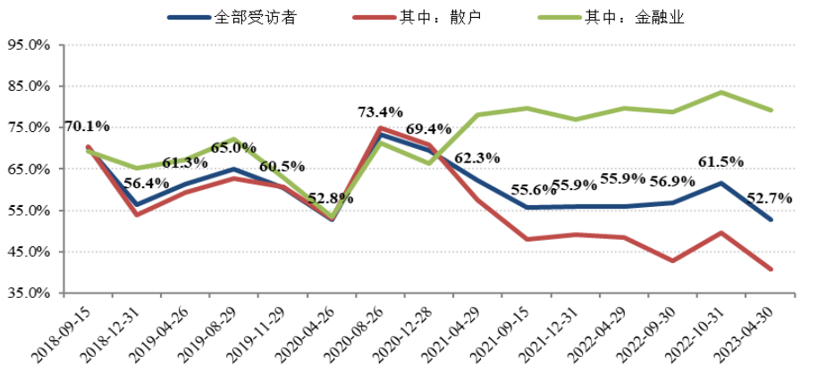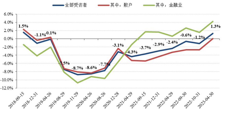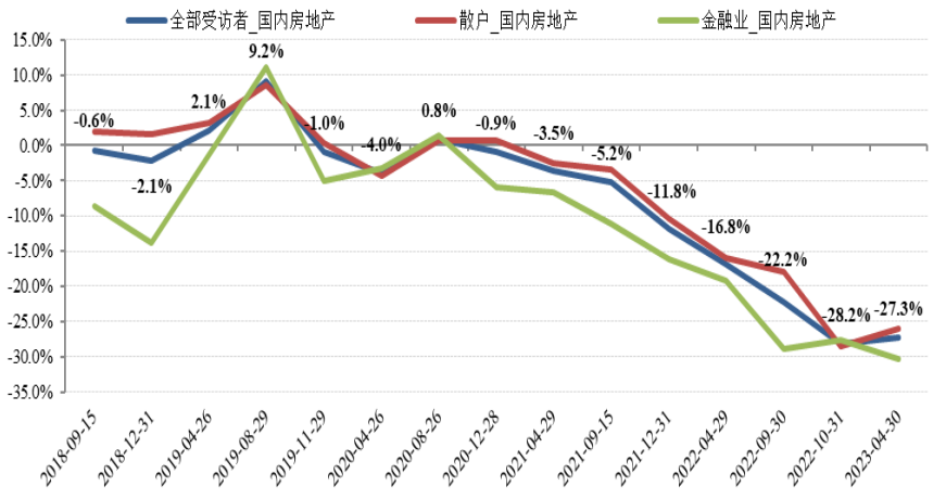 从2020年8月至今,散户对房地产的预期呈下降趋势,金融业受访者对房价的预期比散户乐观,本期也下调了预期。