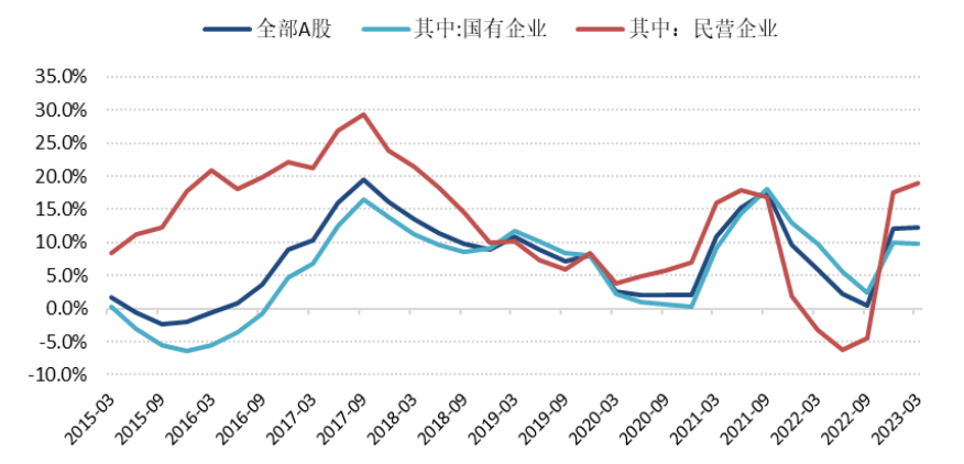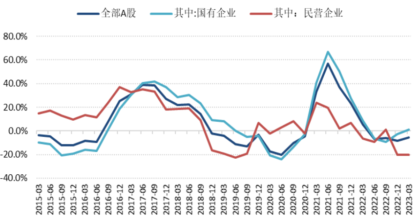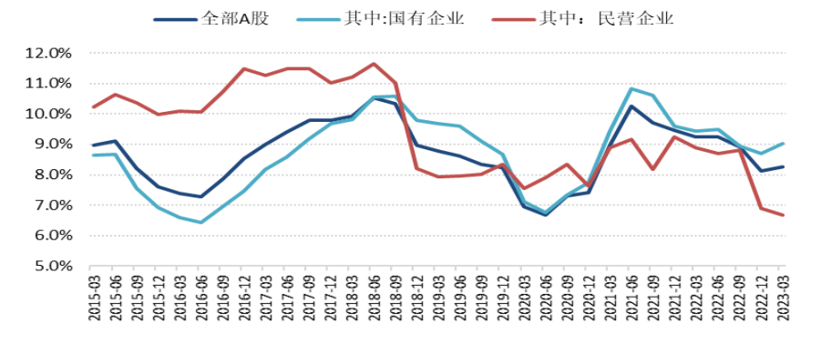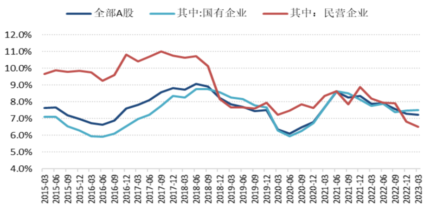 上市公司中,民营企业利润的下滑更为明显,从2021年年中至2023年一季度,民营企业净利润(TTM值)扣除通胀后的同比增速从20%下降至-20%,净经营性资产回报率从8.6%下滑至6.5%,净资产回报率从9.2%下滑至6.7%。