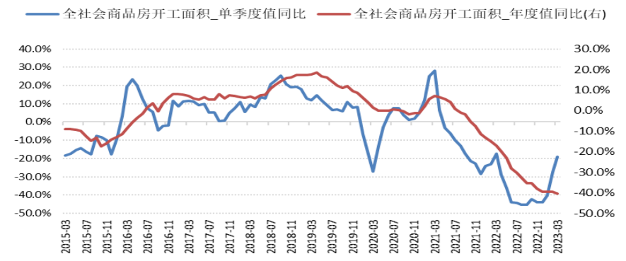 表现最为疲软的是房地产行业,自2021年4月份以来,商品房开工面积同比增速持续下滑,于2021年末落入负增长区间,2022年四季度同比下降44%,2023年一季度有所缓和,仍同比下降19%(图10)。