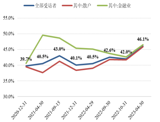 与2022年10月份相比,一季度受访者对A股的预期提高,约74.3%的受访者认为A股会上涨,比上期提高10.2个百分点。