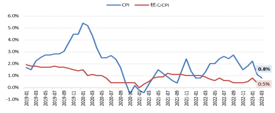 进入2023年,通胀率仍在下降,截至2023年3月,PPI同比下降2.5%,CPI和核心CPI同比增长0.8%和0.5%(图15)。