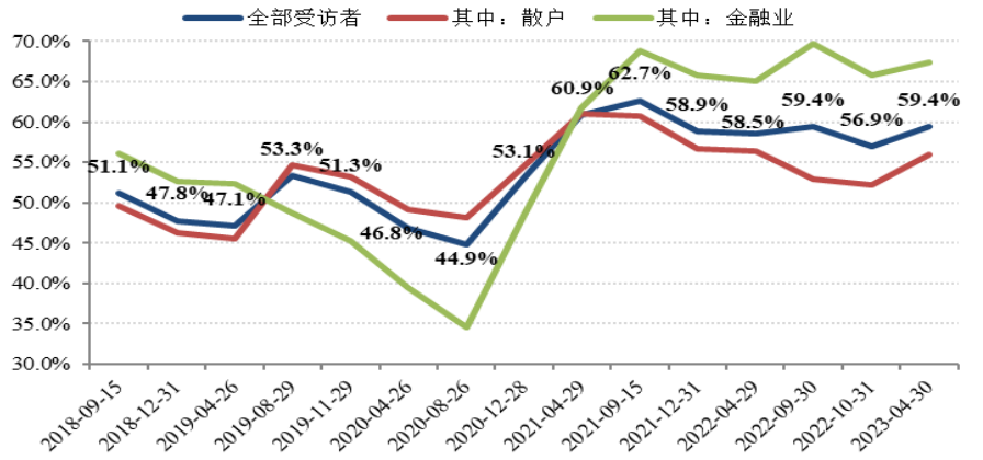 投资者对经济增长的预期回暖。本期,约59.4%的投资者认为未来GDP增速能够超过5%,比上期提高了2.5个百分点。