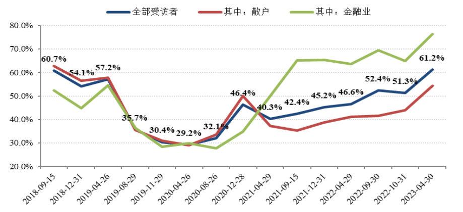 在本次调查中,约61.2%的受访者认为港股会上涨(散户和金融业分别为54.4%和76.5%),比上期上升了9.9个百分点(散户和金融业分别上升了10.4和11.6个百分点)(图3)。