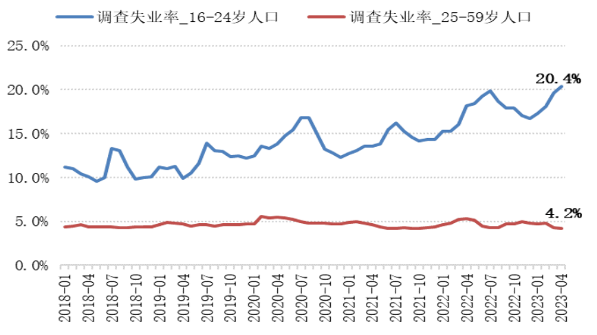 根据国家统计局公布的信息,尽管城镇调查失业率整体上保持稳定,但是青年(16~24岁)失业率自2018年以来一直在上升,2018年青年失业率约10%,2020年提高到12.3%,2021年约14.3%,到2023年4月份已经达到20%(图16)。