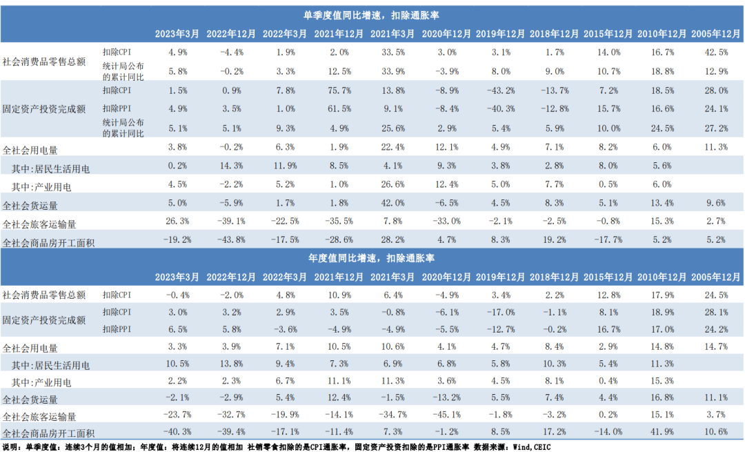 如果比较单季度扣除通胀后的同比增长情况,2021年一季度,社会消费品零售总额同比增长33.5%,2022年一季度增长1.9%,2023年一季度增长4.9%;固定资产投资2021年一季度增长13.8%,2022年一季度增长7.8%,2023年一季度增长1.5%(表1)。