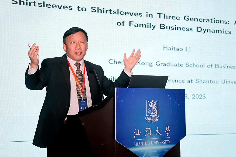 长江商学院学位项目副院长李海涛教授在论坛上发表了题为:“Shirtsleeves to Shirtsleeves in Three Generations: An Economic Model of Family Business Dynamics”的主题演讲。李海涛教授通过建立和分析家族企业发展动力的经济学模型,对家族企业传承中“富不过三代”的经典命题进行了解读。李海涛教授提出,“富不过三代”的原因并不是因为二代太弱,而是一代太强,一个家族企业的发展,终究会面临均值回归的趋势,我们普遍看到家族企业传承成功的案例,可能存在幸存者偏差,而“富不过三代”才是符合经济发展规律的普遍现象。