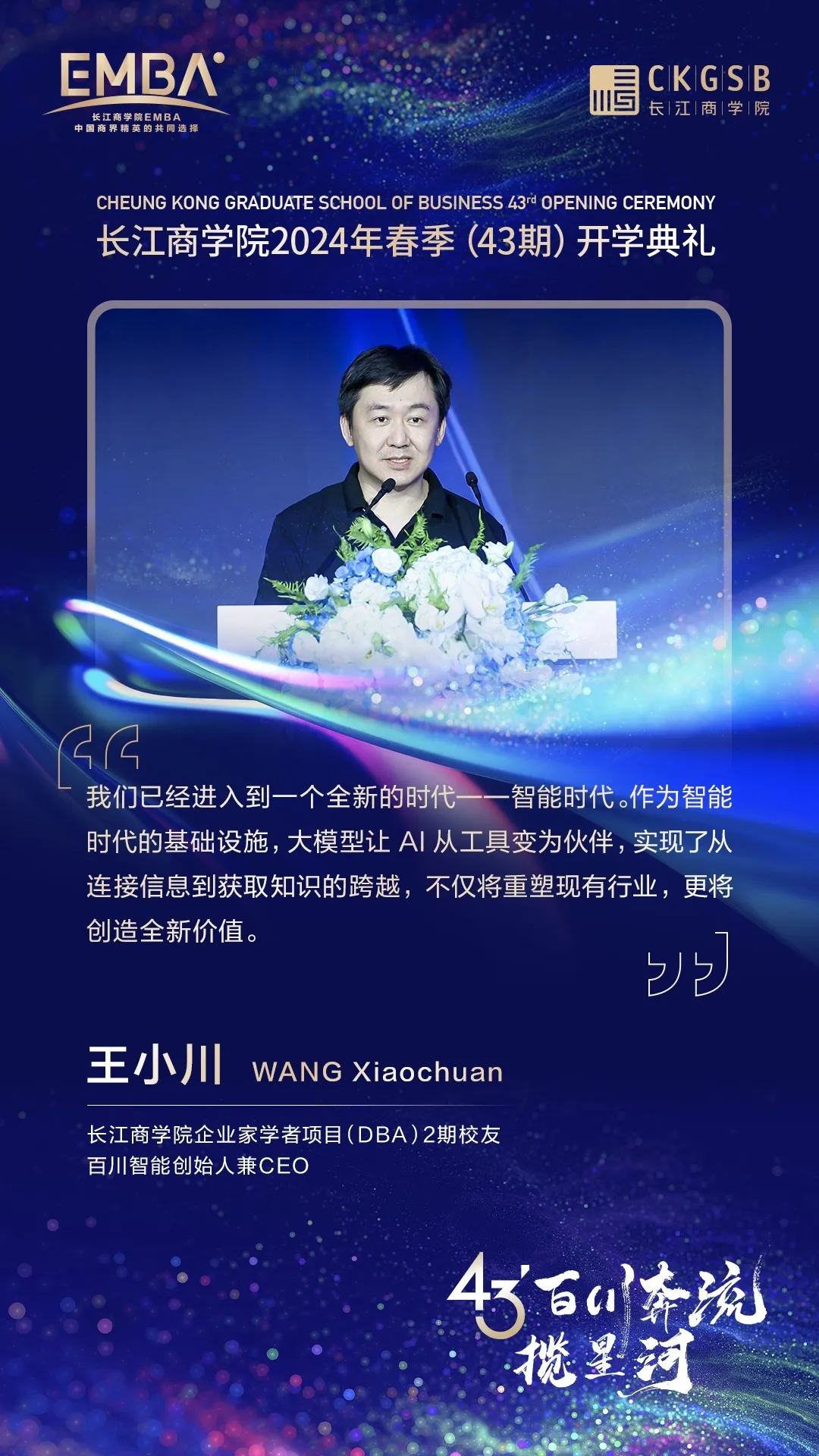 本次《至诚讲坛》第五期,迎来主讲人长江商学院企业家学者项目(DBA)2期校友、百川智能创始人王小川,分享《通用智能时代的展望》。王小川师兄表示,当下我们正身处AGI(通用人工智能)时代的创造与变革之中,也正经历工业革命后的精细化分工。AI能够告诉我们如何成为自己希望成为的人,自我实现会变得更为容易。