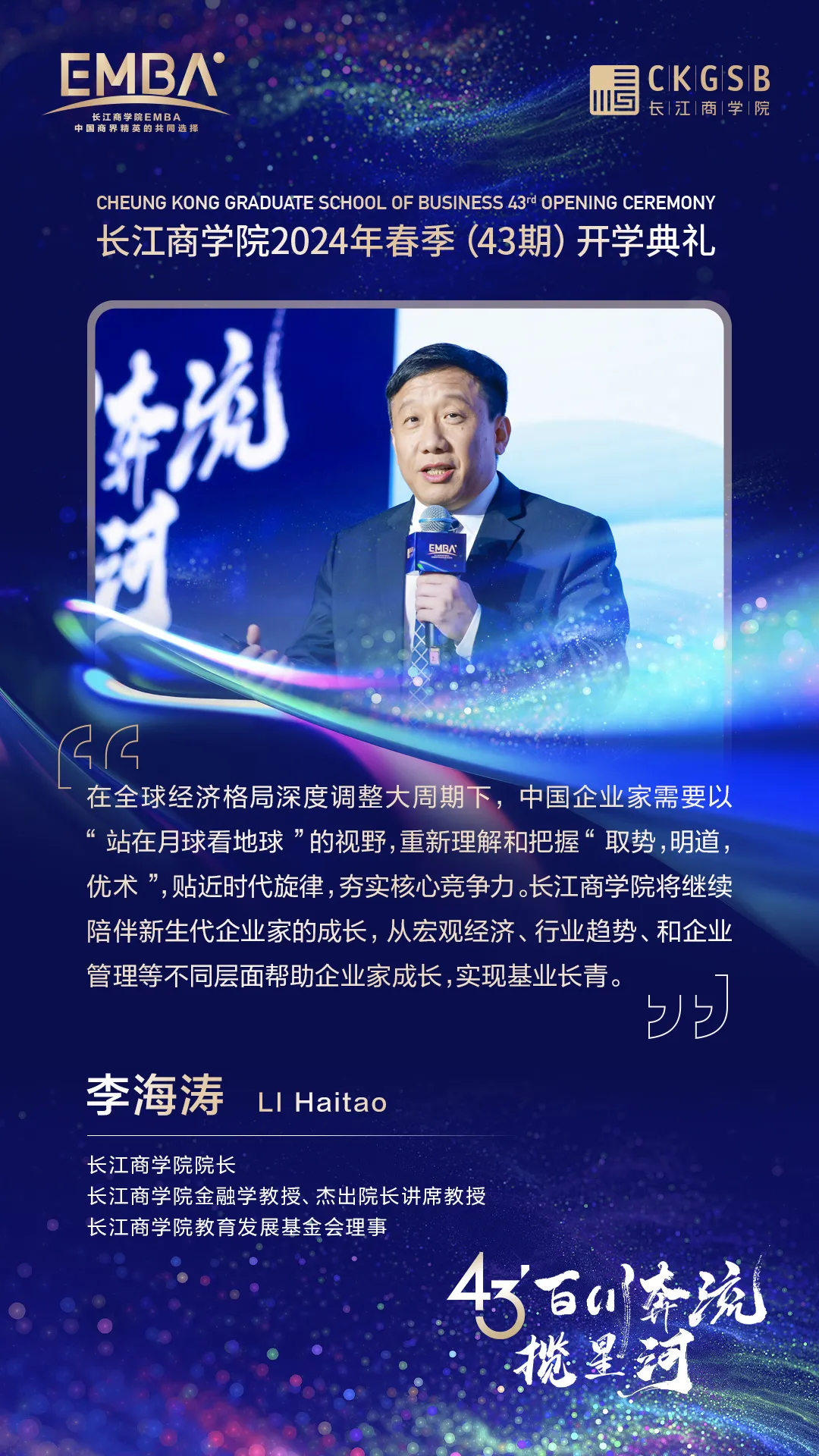典礼伊始,长江商学院院长、长江商学院金融学教授、杰出院长讲席教授、长江商学院教育发展基金会理事李海涛博士,发表开场致辞,他与在座全体师生分享了长江商学院成立至今的历史脉络。李海涛院长指出,在这个百年不遇的大变局中,中国企业家需要以“站在月球看地球”的视野,重新理解和把握“取势,明道,优术”,抓住全球经济发展的大势,明确企业的发展方向,并优化经营策略以提高效率。