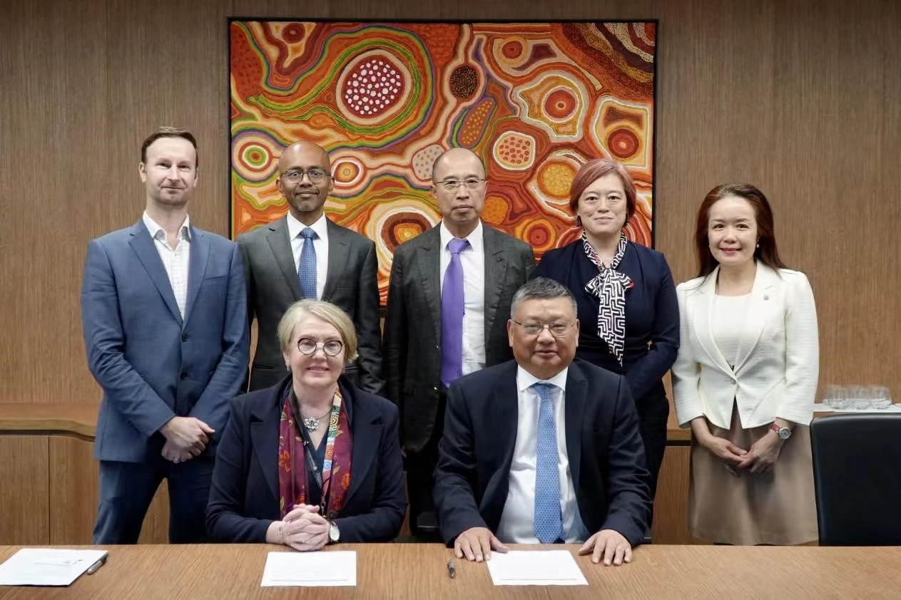 长江商学院创办院长、中国商业管理及全球化杰出院长讲席教授项兵(前排右一)与悉尼大学商学院院长莱萨·萨金特(前排左一)签署战略合作协议