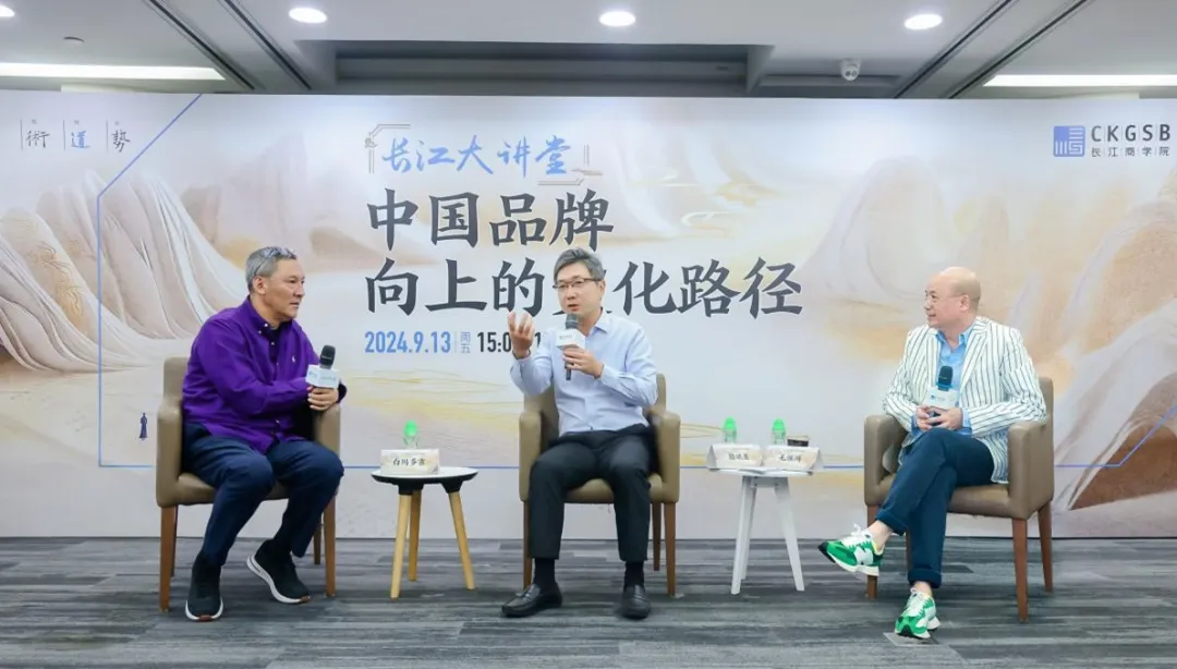 2024年9月13日,长江商学院品牌论坛“长江大讲堂”第51期在北京校区成功举办。长江商学院战略学教授、战略研究副院长、新生代独角兽全球生态体系研究中心主任滕斌圣,与松赞集团创始人、董事长白玛多吉和例外时尚与方所文化创始人、中国服装协会副会长、长江商学院DBA、CEO、EMBA校友毛继鸿同台对话,围绕中国品牌向上的文化路径、企业如何从价格竞争转向价值竞争、优秀传统文化如何帮助中国品牌在全球市场突围等重要议题进行了深入交流与探讨。