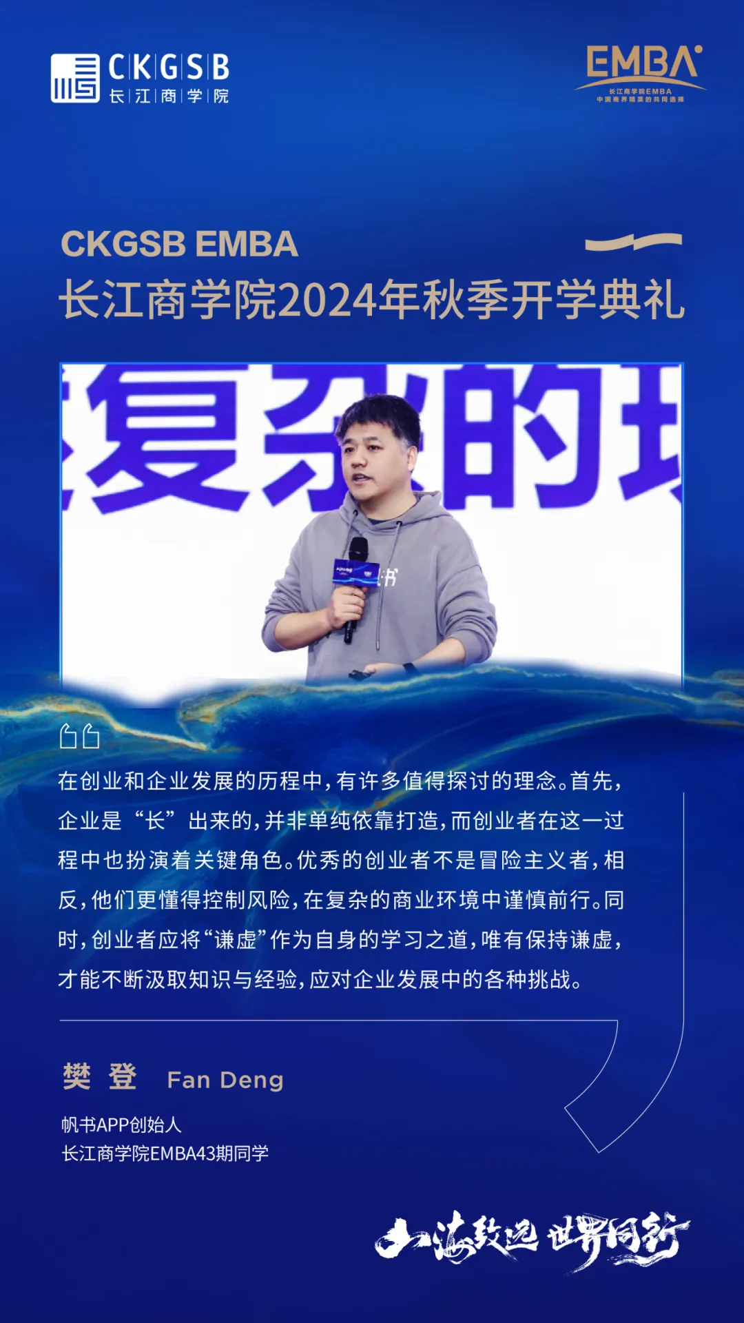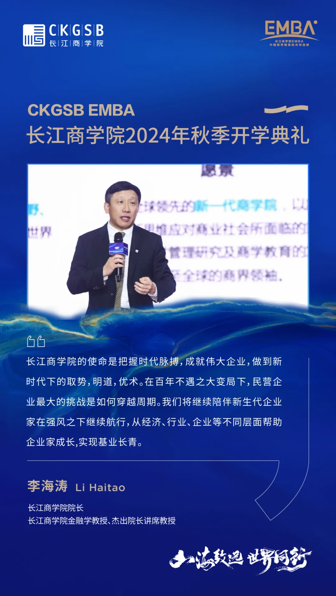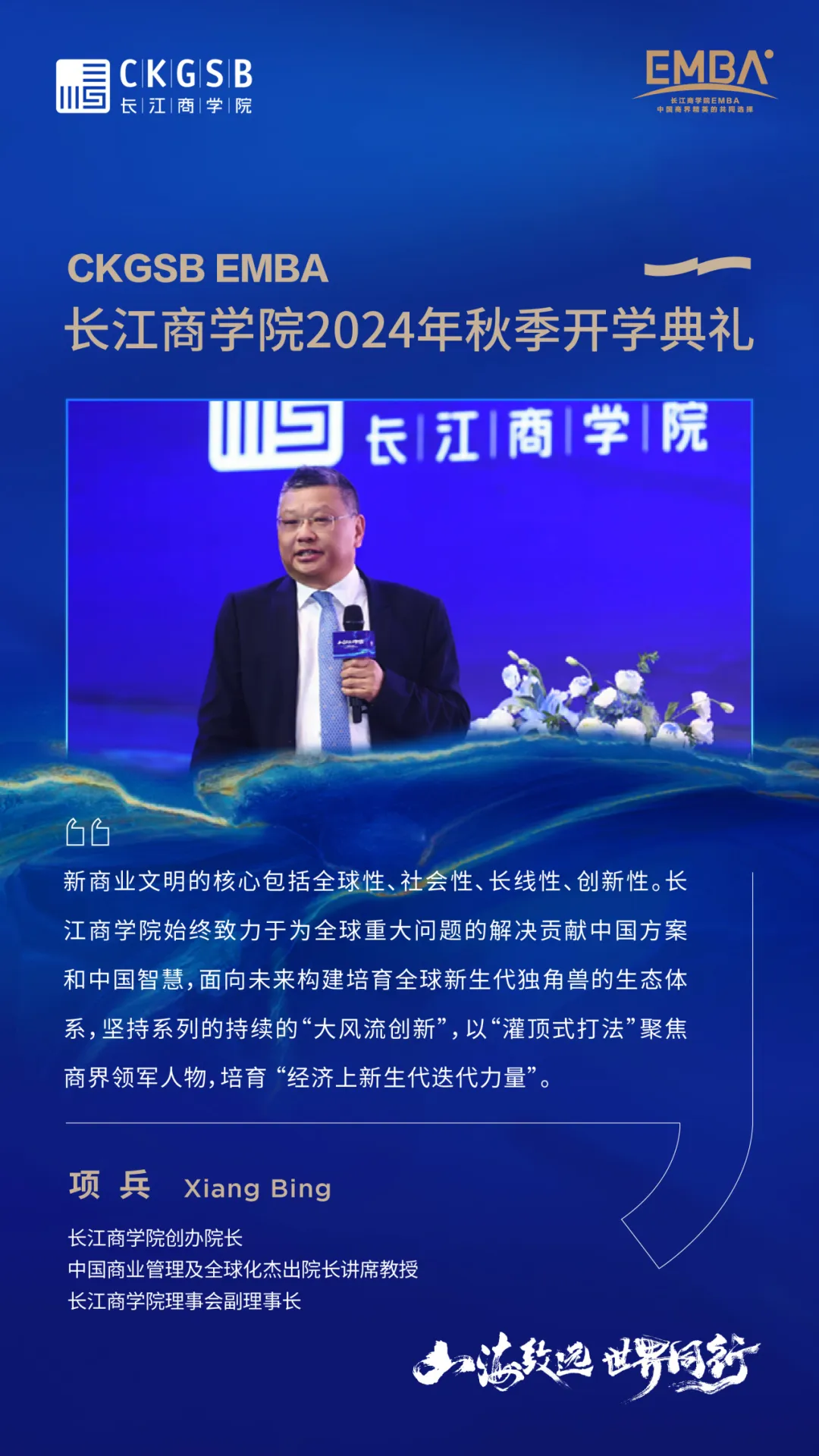 山海致远,世界同行。EMBA2024年秋季班在长江的新征程正式拉开帷幕,祝愿新生在长江的课堂上收获真知与挚友,为全球商业的持续创新与社会的长足发展贡献中国企业家的力量。