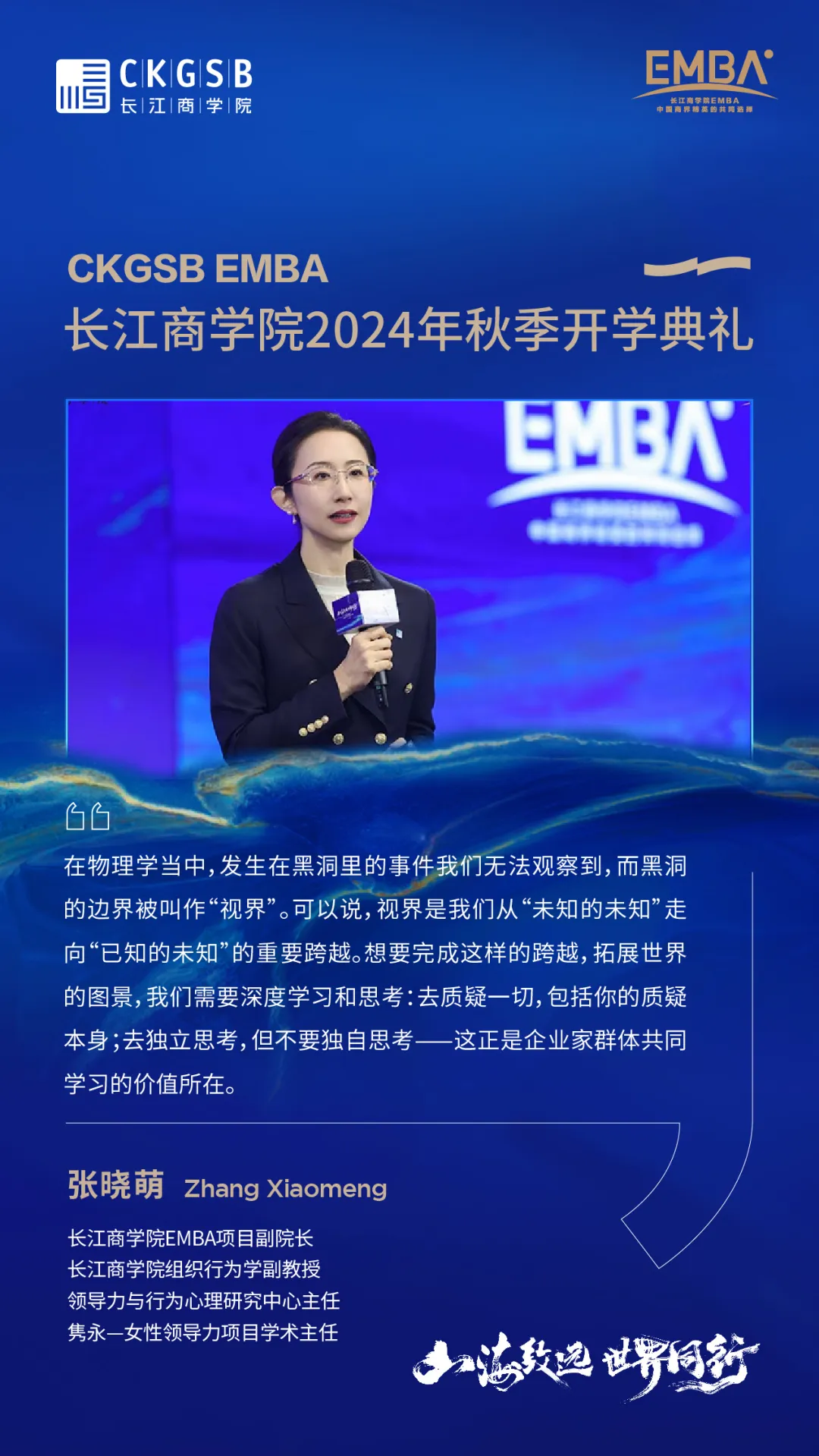 在谈及个人视野与学习力相互之间关系时,长江商学院EMBA项目副院长、长江商学院组织行为学副教授、领导力与行为心理研究中心主任、隽永-女性领导力项目学术主任张晓萌教授发表主旨演讲《视界·世界》,详细展示了长江商学院的学术环境、学者特质、学习内容及学习方法,展望未来的发展方向。